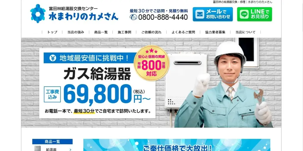 WEBフォームから成約した場合、3000円オフになる割引キャンペーンも実施。予算が少ない場合でも給湯器交換ができるよう、利用者目線に立ったサービスを提供している業者です。