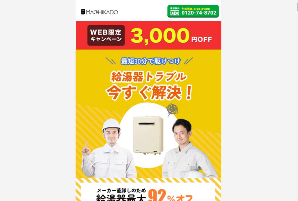 街角給湯相談所は関東・関西エリアを中心に給湯器交換を行っている給湯器交換業者です。365日受付可能で、電話受付は9時〜20時までですが、WEBフォームでは24時間受付可能です。